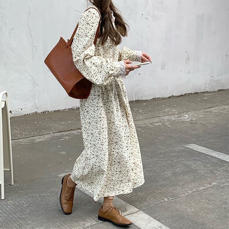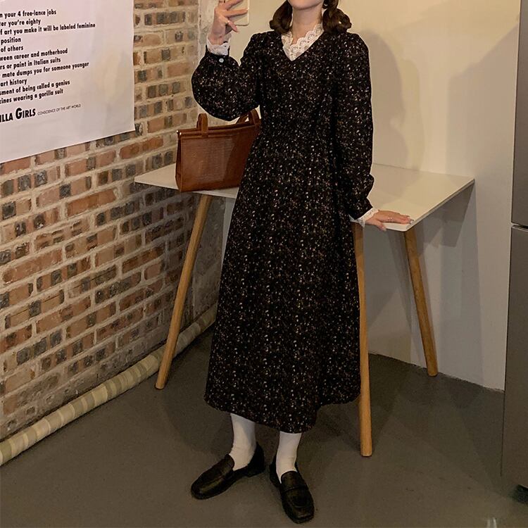 2色 ワンピース 長袖 春 かわいい ロング フレアスカート ロング丈 ボリューム袖 Vネック セミフレア レース フリル ウエストゴム ブラック アプリコット ワンサイズ ゆったり かわいい 大人可愛い 上品 おしゃれ 柄 花柄 小花柄 韓国系 オルチャン コーデ 楽ちん モテ 体型カバー プチプラ 安い インスタ映え キュート ガーリー 存在感 OL 学生 通学 デート お出かけ 女子会 お泊まり イベント 旅行 ショッピング 映画館 誕生日 高校生 中学生 OL 学生 10代 20代 30代