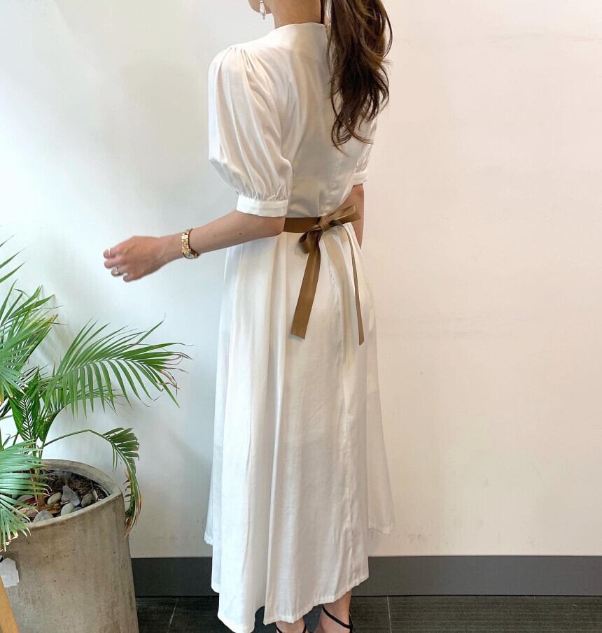 2色 リボン ワンピース 半袖 春夏 きれいめ かわいい フォーマル ワンピドレス 膝下 ミディアム丈 ミドル丈 パフスリーブ Uネック ラウンドネック 襟なし セミフレア Iライン 切り替えデザイン リボン ウエストリボン バックリボン 透け感 色展開 ホワイト くすみカラー カラバリ アプリコット ワンサイズ かわいい 大人可愛い きれいめ シンプル 大人 上品 おしゃれ 無地 コーデ スタイル モテ 体型カバー 美脚 脚長 こなれ感 ラブリー キュート ガーリー セクシー エレガント とろみ感