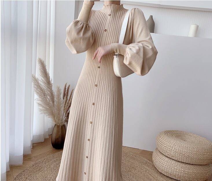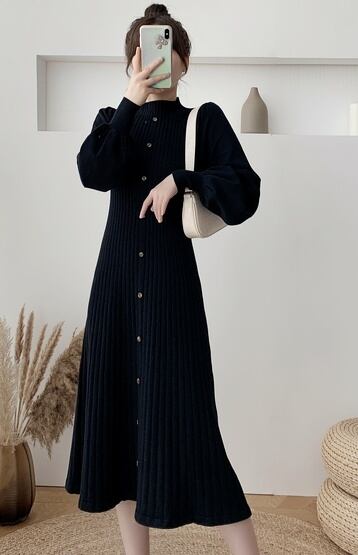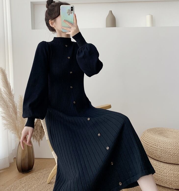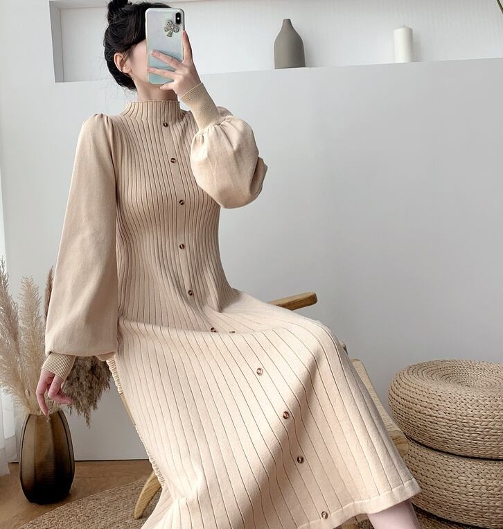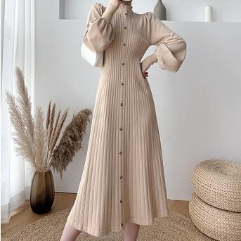 2色 ワンピース 長袖 秋冬 きれいめ ロング aライン Aライン ニット ワンピ ミドル丈 ボリュームスリーブ スタンドカラー スリム 細身 ボタン ブラック ベージュ ワンサイズ ジャスト 大人可愛い きれいめ シンプル 大人 上品 ナチュラル 無地 韓国系 オルチャン コーデ スタイル モテ 美脚 脚長 プチプラ 流行 インスタ映え こなれ感 個性的 主役級 存在感 OL 通勤 学生 通学 デート お出かけ 女子会 パーティー イベントレストラン 誕生日 入学式 入園式 卒業式 卒園式 謝恩会