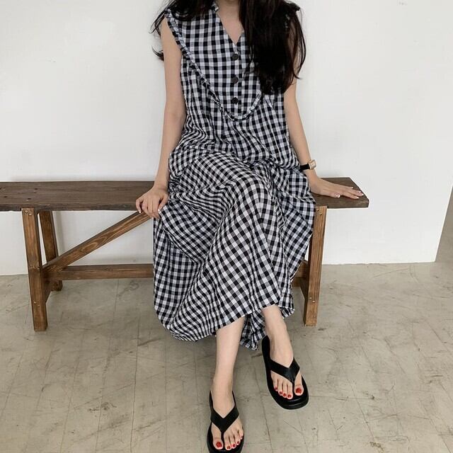 2色 ワンピース ノースリーブ 夏 かわいい ロング マキシ ロング丈 マキシ丈 9分丈 Vネック 襟付き 大きな襟 ビッグカラー フリルカラー ストレート Iライン スマート 黒 ブラック 緑 グリーン ワンサイズ 大きいサイズ フリーサイズ 大きめ ゆったり ゆる かわいい 大人可愛い カジュアル さわやか チェック柄 楽ちん 体型カバー 脚長 普段使い ラフ ラブリー キュート ガーリー デート お出かけ 公園デビュー 女子会 休日 ショッピング レディース マタニティ ぽっちゃり 10代 20代