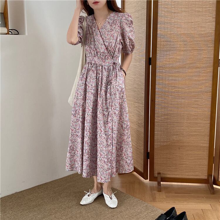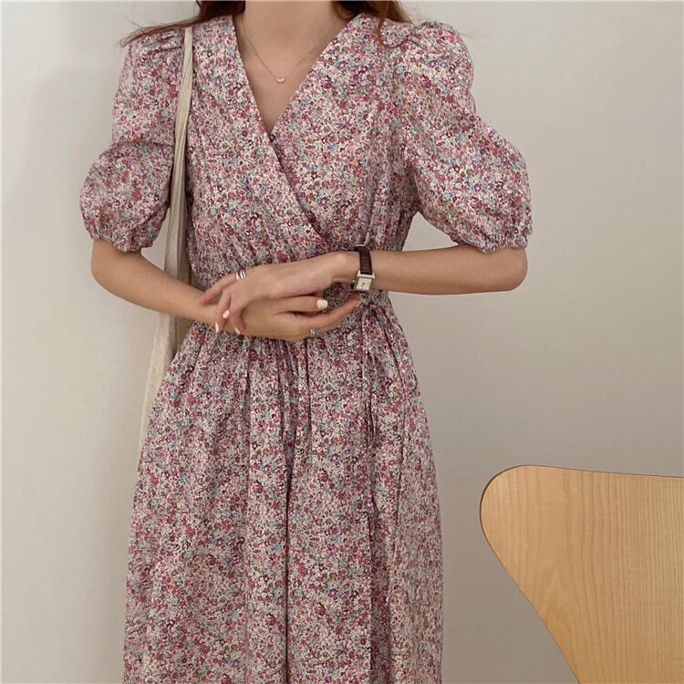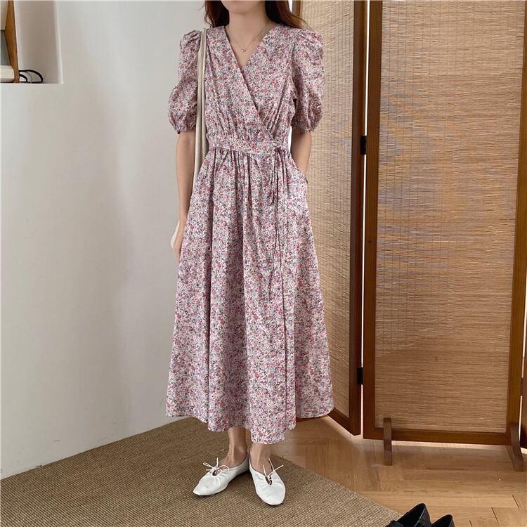 レトロ風 ワンピース 半袖 春 秋 きれいめ ロング aライン Aライン フレア ロング丈 7分丈 ボリューム袖 ボリュームスリーブ パフスリーブ Vネック カシュクール フレア スリム 細身 ウエストマーク ウエストリボン ハイウエスト 紫 パープル ピンク 春カラー ワンサイズ フリーサイズ ジャスト かわいい 大人可愛い シンプル カジュアル おしゃれ フェミニン 花柄 小花柄 韓国系 モテ 普段使い ラブリー キュート ガーリー OL 通勤 デート お出かけ 女子会 パーティー ショッピング