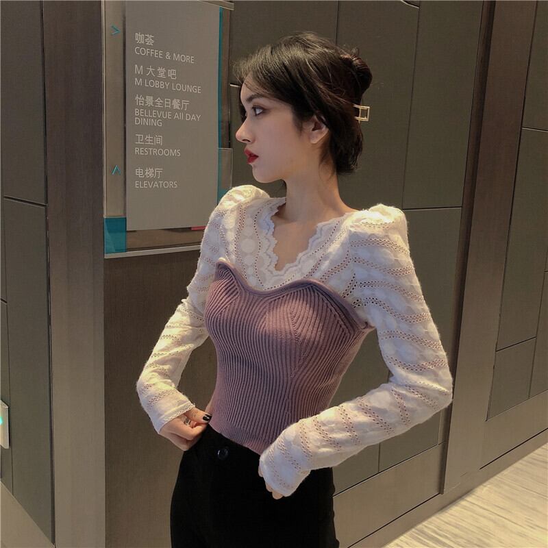 2色 トップス シャツ カットソー ニット レディース 秋冬 冬 春 かわいい きれいめ 長袖 長袖 パフスリーブ ラウンドネック 襟なし 切り替えデザイン スリム タイト 細身 レース 透け感 伸縮性 ブラック パープル 春カラー 秋カラー S M L ジャスト かわいい 大人可愛い 大人 おしゃれ ナチュラル 無地 コーデ スタイル 楽ちん 着回し モテ 穴あき トレンド 流行 インスタ映え 10代 20代 30代 こなれ感 ラフ ラブリー キュート ガーリー 個性的 セクシー 主役級