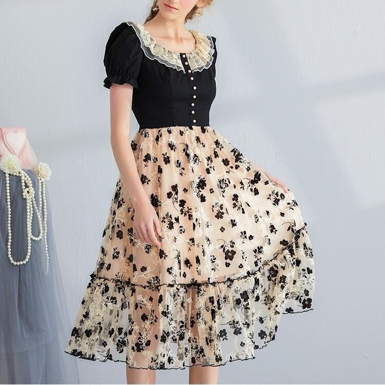 ワンピース 半袖 春 夏 春夏 きれいめ かわいい aライン Aライン フレア ワンピドレス フレアスカート ひざ丈 膝下 ぽわん袖 パフスリーブ ラウンドネック 襟付き フリルカラー セミフレア 細身 Aライン 切り替えデザイン ドッキング 刺繍 チュール シフォン 黒 ブラック S M L XL 2XL ジャスト かわいい 大人可愛い きれいめ シンプル カジュアル 大人 上品 おしゃれ 無地 花柄 コーデ スタイル モテ 美脚 脚長 インスタ映え こなれ感 ラブリー キュート ガーリー セクシー