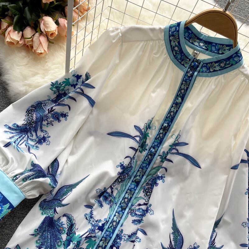 ブラウス レディース シャツ スタンドカラー シャツブラウス おしゃれ 長袖シャツ 個性 長袖 可愛い 大人女子 カジュアル 大人カジュアル お出かけ 女子会 デイリー 参観日 二次会 パーティー OL 通勤 スリム きれいめ ルーズ 10代 20代 30代 ミドル丈 上品 フレンチスタイル 春 秋 シンプル プレーン パフスリーブ レギュラー プリント 鳥 フラワー 花柄 ホワイト 白 ブルー 青
