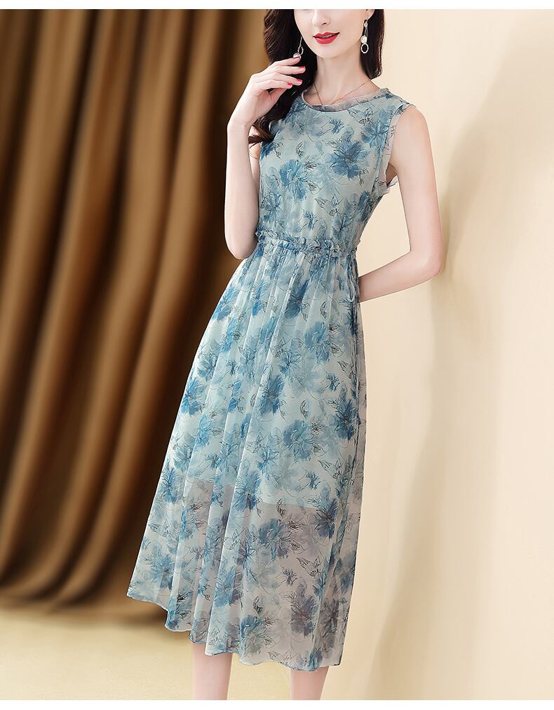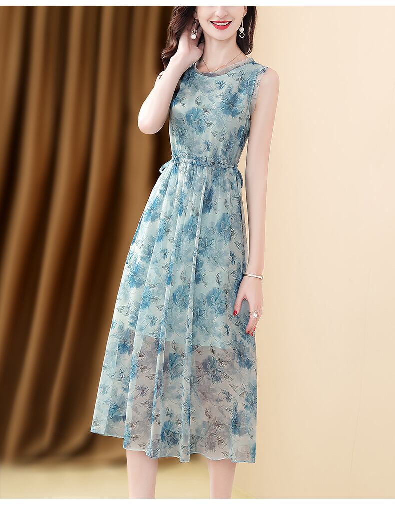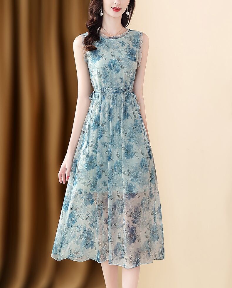 ワンピース ノースリーブ 夏 春夏 かわいい aライン Aライン フレア フレアスカート 膝下 ミモレ丈 ラウンドネック 襟なし フレア セミフレア スリム 細身 ストレート Aライン スマート シフォン ふわふわ 透け感 ブルー S M L XL 2XL ジャスト かわいい 大人可愛い きれいめ 大人 上品 おしゃれ 柄 コーデ スタイル モテ 美脚 脚長 インスタ映え こなれ感 ラブリー キュート ガーリー 個性的 セクシー エレガント 主役級 存在感 抜け感 OL 通勤 学生 ママコーデ