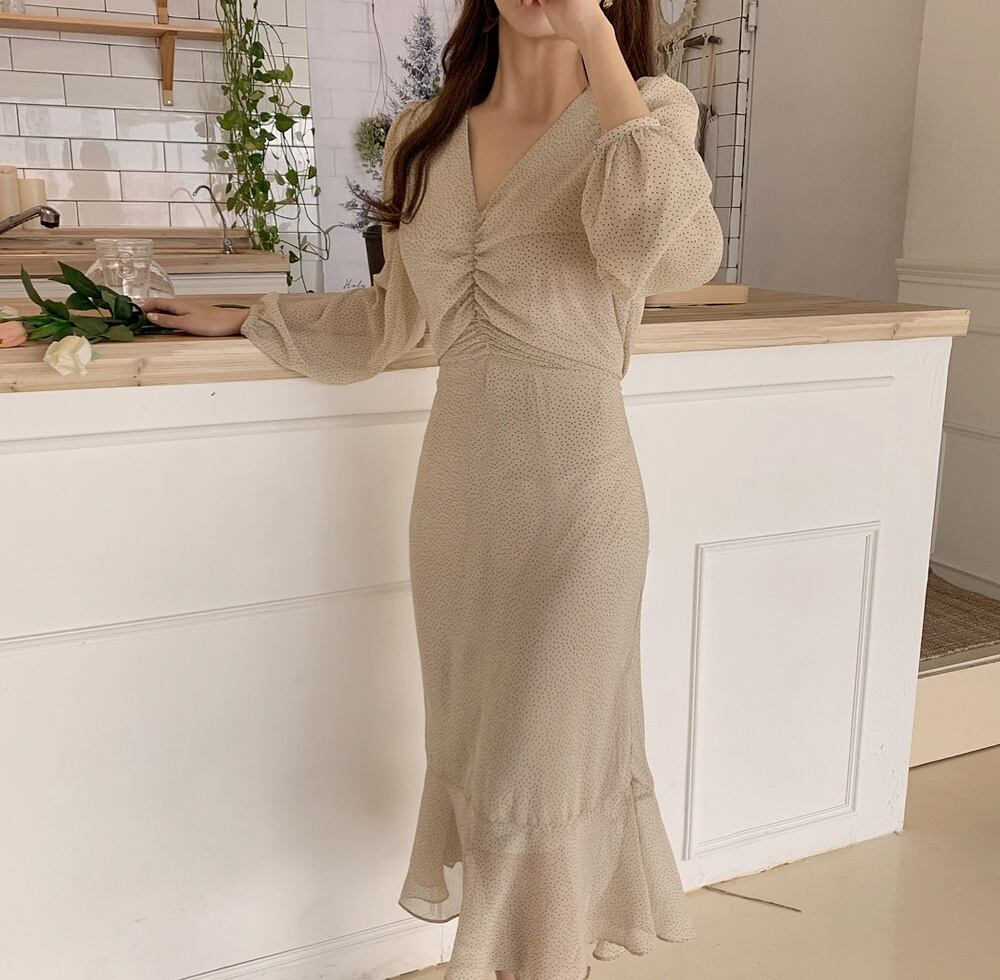 ワンピース 長袖 春 夏 秋 きれいめ フォーマル aライン フレアスカート ミモレ丈 ぽわん袖 萌袖 Vネック 深 Vネック 襟なし スリム タイト 細身 マーメイド 切り替えデザイン スマート シフォン ウエストマーク ふわふわ 透け感 ベージュ 大人カラー S M L XL ジャスト かわいい 大人可愛い きれいめ 大人 上品 おしゃれ 水玉 コーデ スタイル モテ インスタ映え こなれ感 セクシー エレガント 主役級 存在感 とろみ感 抜け感 OL 学生 ママコーデ デート お出かけ パーティー