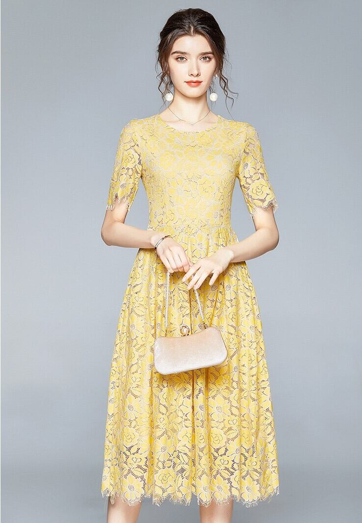 ワンピース 半袖 春 夏 秋 春夏 きれいめ フォーマル aライン Aライン フレア ワンピドレス 膝下 ミモレ丈 ミディアム丈 五分袖 クルーネック 襟なし フレア スリム 細身 ストレート レース ブルー イエロー かわいい 大人可愛い きれいめ シンプル 大人 上品 おしゃれ 花柄 フラワー スタイル モテ 脚長 こなれ感 ラブリー エレガント 抜け感 ママコーデ デート パーティー イベント 入園式 卒業式 卒園式 謝恩会 結婚式 二次会 披露宴 低身長 高身長 レディース ママ
