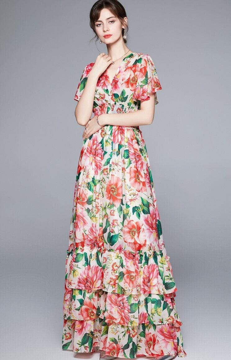 華やかな花柄と色合いが目を引くマキシ丈ワンピース。