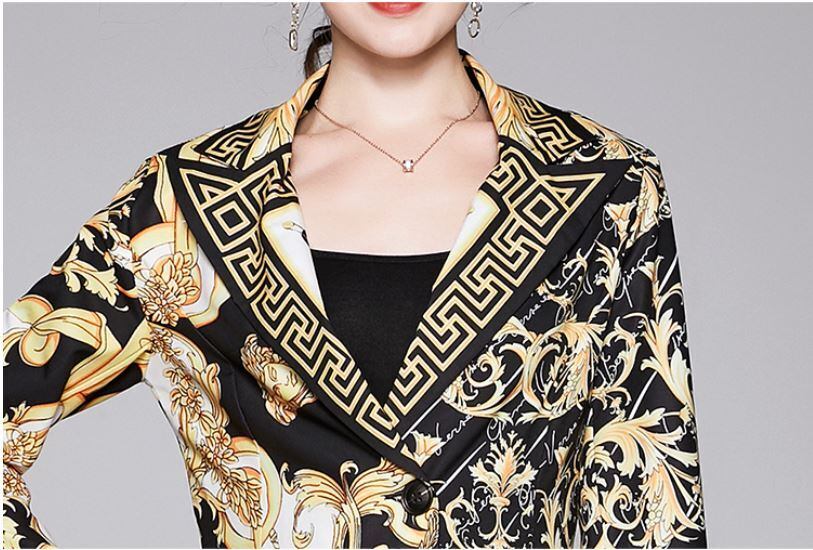 華やかなスカーフ柄のジャケットとパンツのセットアップ。