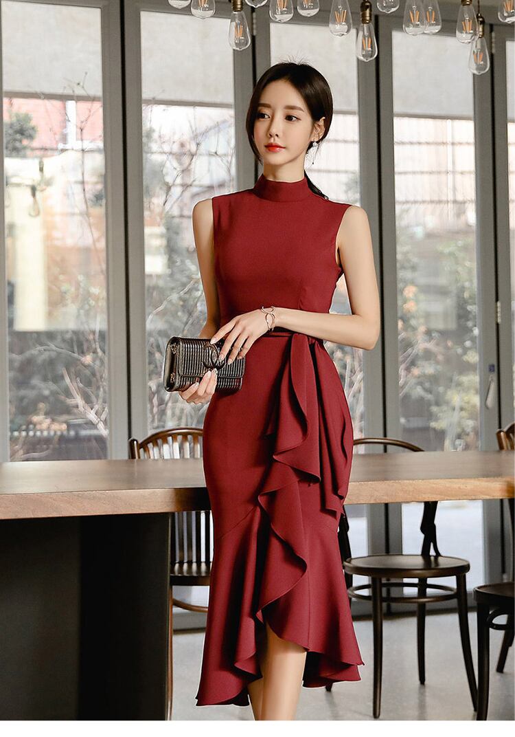 ワンピース ノースリーブ 春 秋 きれいめ かわいい フォーマル ワンピドレス 膝下 ミディアム丈 ミドル丈 ハイネック スリム タイト 細身 切り替えデザイン フリル リボン ウエストリボン ファスナー 色展開 ブラック 大人カラー ワインレッド S M L XL かわいい 大人可愛い きれいめ シンプル 大人 上品 おしゃれ 無地 モテ 美脚 クール セクシー エレガント モダン 主役級 存在感 フォーマル お出かけ 女子会 パーティー イベント ホテル レストラン 謝恩会 結婚式 二次会 披露宴