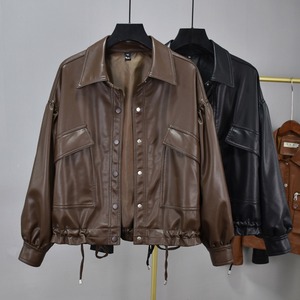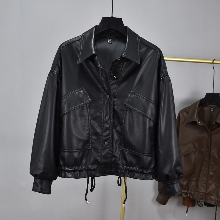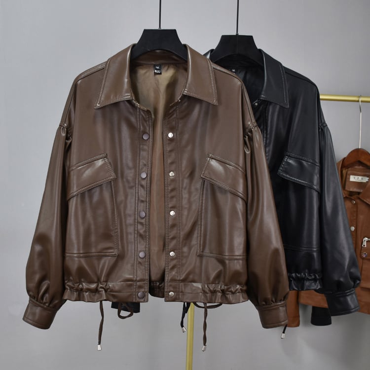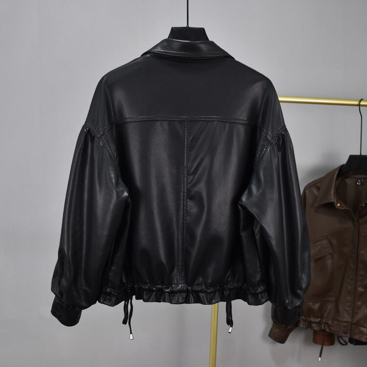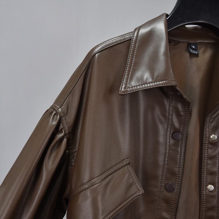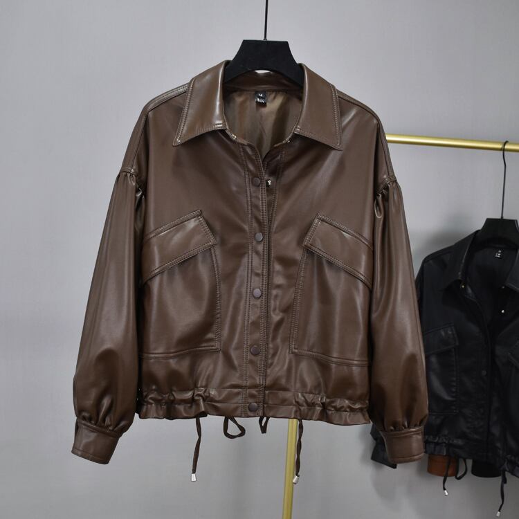2色 アウター ジャケット レディース 秋冬 春 きれいめ 革ジャン フェイクレザー ショート丈 レギュラー丈 長袖 ボリューム袖 襟付き レギュラーカラー スリム タイト 細身 ストレート スマート ポケット 前開き 黒 ブラック 茶色 ブラウン 大人カラー 秋カラー M L XL 大人可愛い きれいめ シンプル カジュアル 大人 おしゃれ かっこいい 無地 韓国 韓国系 オルチャン ファッション スタイル 暖かい 防寒 体型カバー 定番 普段使い インスタ映え こなれ感 ラフ メンズライク