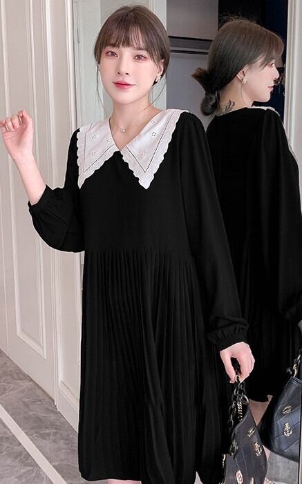レトロ風 ワンピース 長袖 春 秋 きれいめ カジュアル かわいい フォーマル aライン Aライン ワンピドレス プリーツスカート 膝丈 ひざ丈 ミモレ ミモレ丈 キャンディスリーブ 萌袖 襟付き 大きな襟 ドールカラー ワイドカラー でか襟 ビッグカラー フレア セミフレア 切り替えデザイン シフォン 黒 ブラック モノトーン L XL 2XL 3XL 4XL かわいい 大人可愛い きれいめ シンプル カジュアル 大人 上品 おしゃれ ナチュラル 無地 韓国 韓国系 オルチャン 韓国ファッション