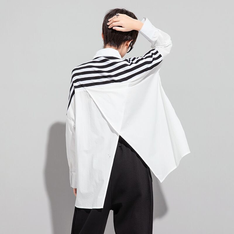 オーバーサイズアシメシャツ レディース シャツ 短丈 長袖 ワイド アシンメトリー BIGシルエット 切り替えデザイン 前開き 異素材MIX シンプル カジュアル お洒落 大人女子 こなれ感 メンズライク マニッシュ ボーイッシュ ルーズ 個性的 クール モード系 主役級 存在感 抜け感 デイリーユース 無地 ボーダー 春 夏 秋 シーズンレス 10代 20代 30代 40代 体型カバー 楽ちん ビジネス OL 通勤 学生 通学 デート お出かけ 普段使い 韓国 ファッション トレンド ゆったり ゆる