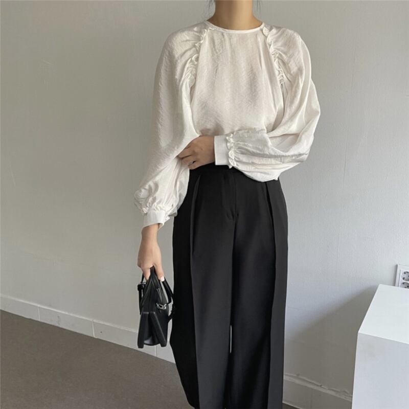 3色 トップス シャツ ブラウス カットソー プルオーバー レディース 夏 春 秋 かわいい きれいめ カジュアル ゆったり 長袖 ボリューム袖 キャンディスリーブ ぽわん袖 Uネック ラウンドネック フレア セミフレア 裾イン フリル シンプル 白 ホワイト 紫 パープル くすみカラー 春カラー アプリコット ワンサイズ かわいい 大人可愛い きれいめ シンプル カジュアル 大人 上品 おしゃれ ナチュラル 無地 韓国 韓国系 オルチャン 韓国ファッション 楽ちん 体型カバー 定番 普段使い インスタ