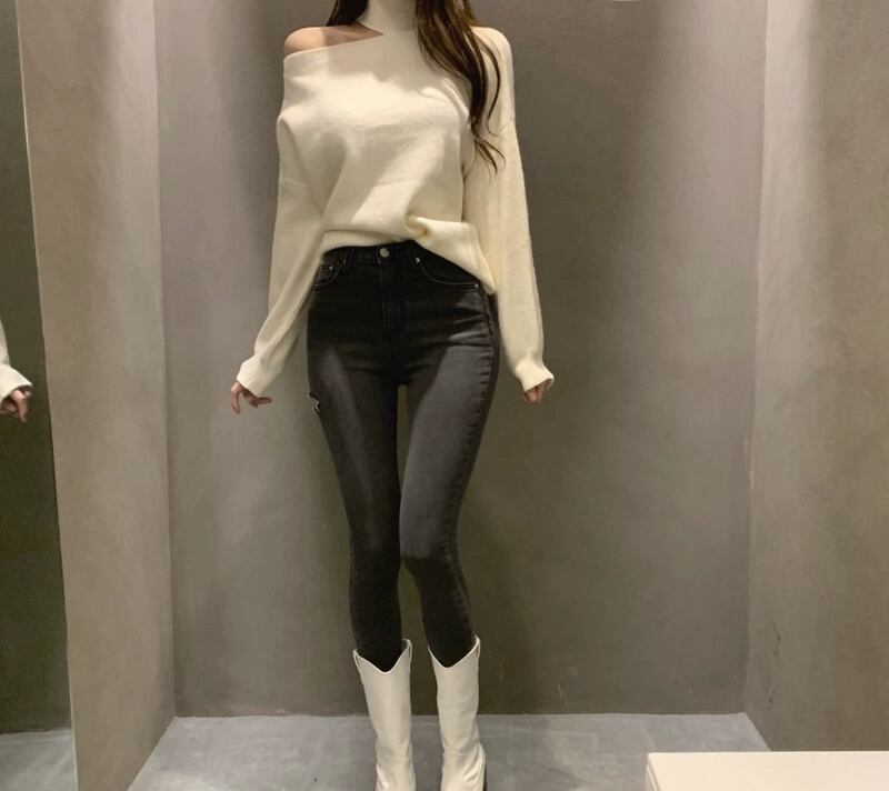 アシンメトリーデザインと程よい肩の肌見せが目を引くデザインニットプルオーバー。