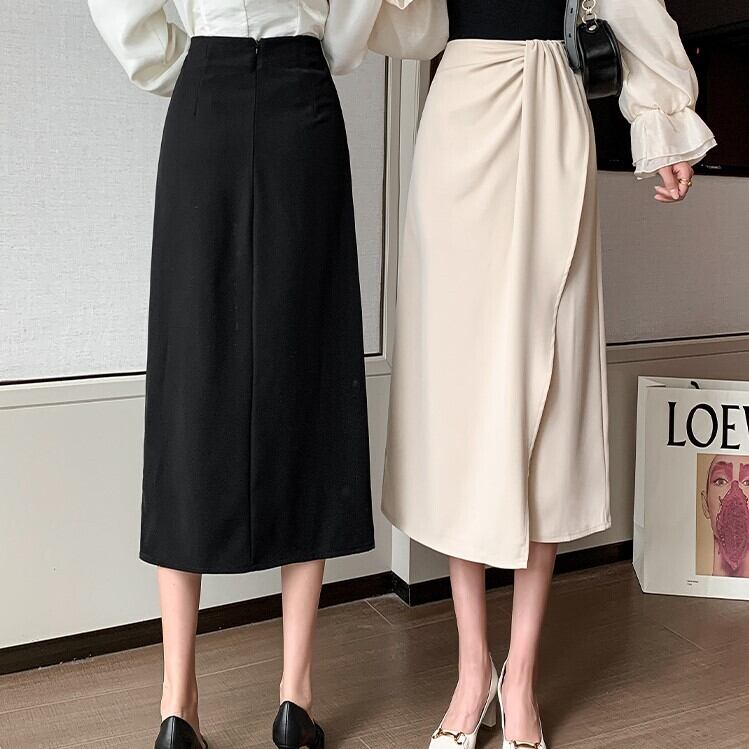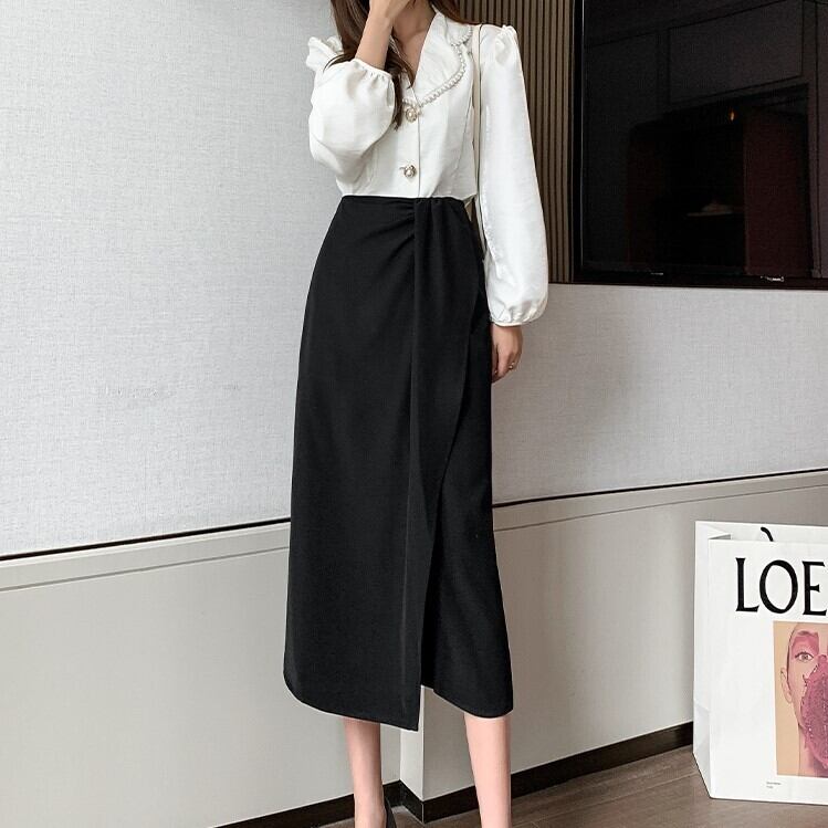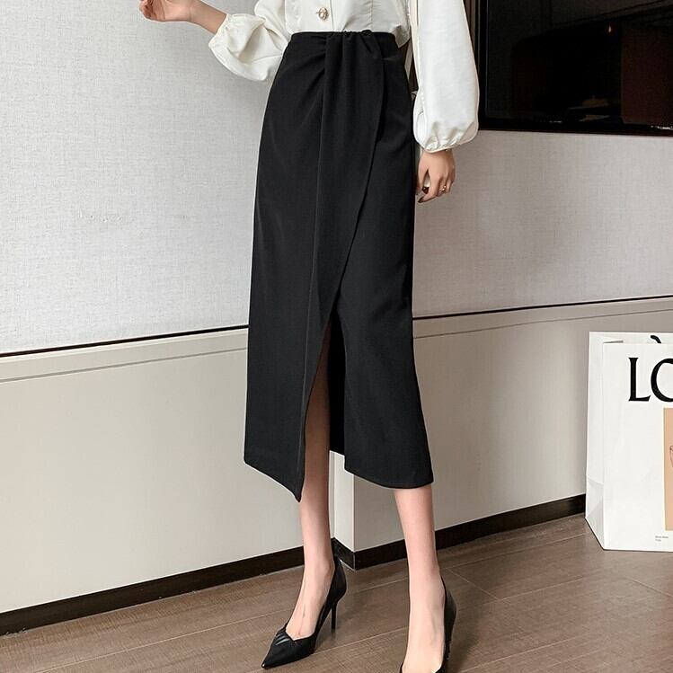 タイトストレートシルエットのラップ風スカート。