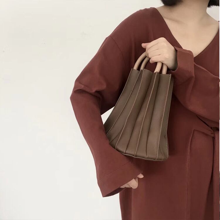 プリーツデザインが印象的なバケツバッグ。