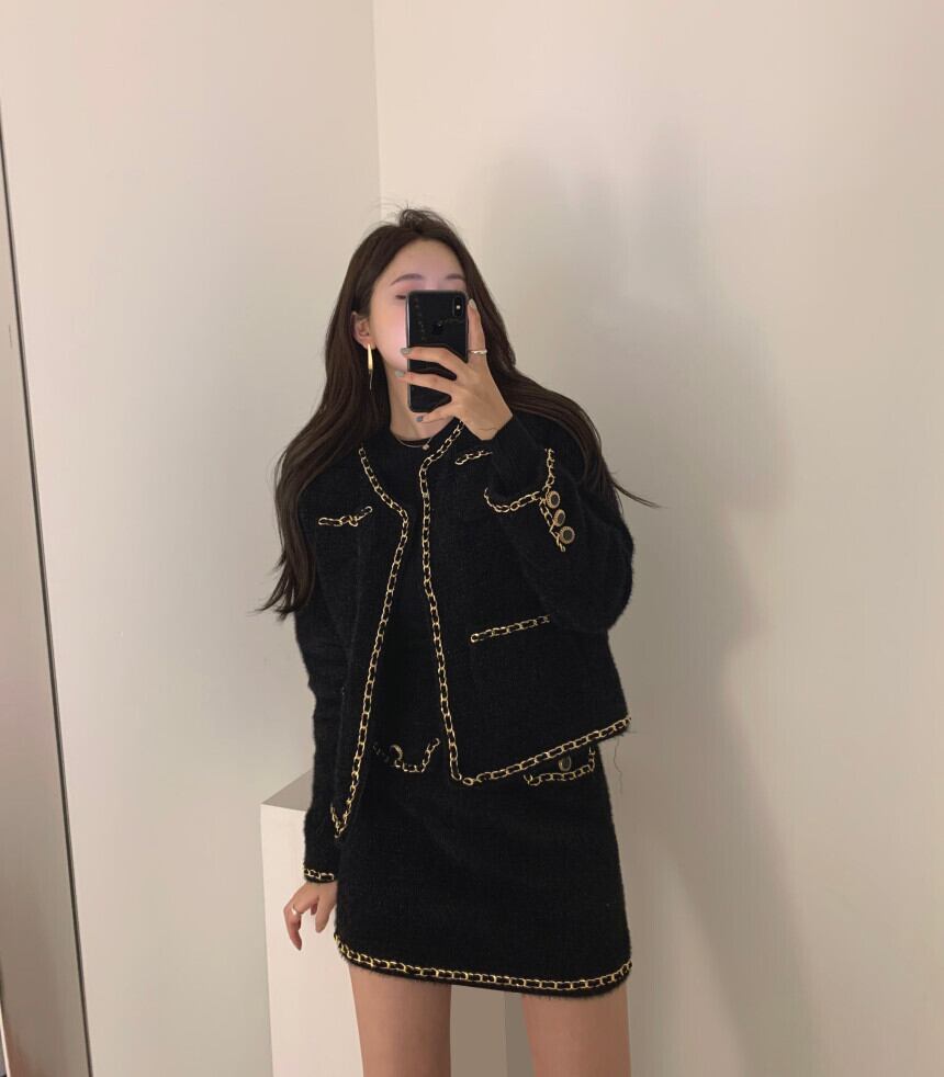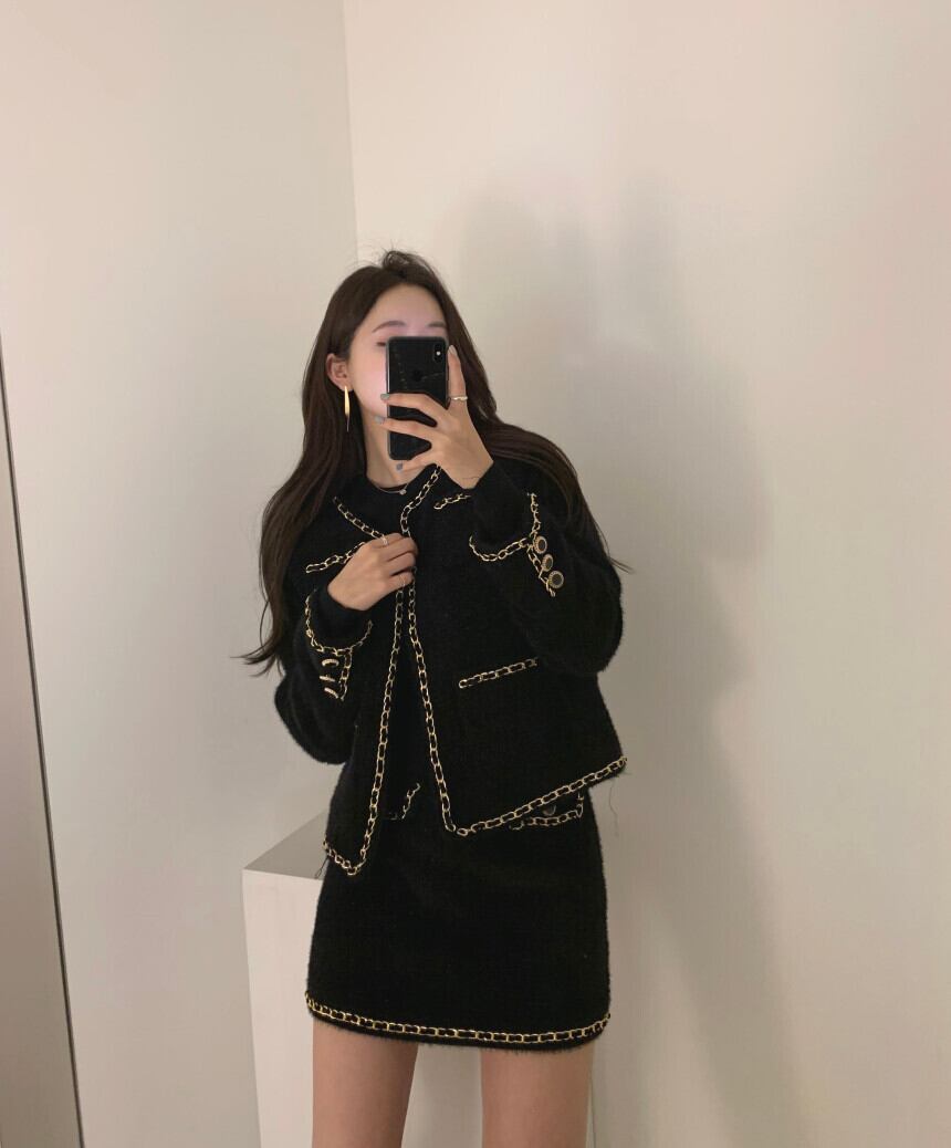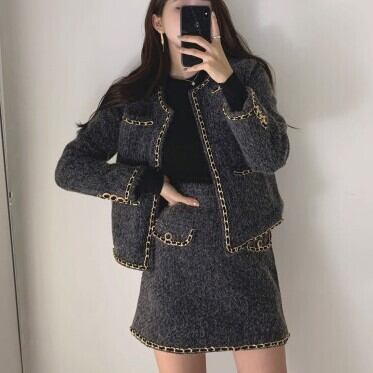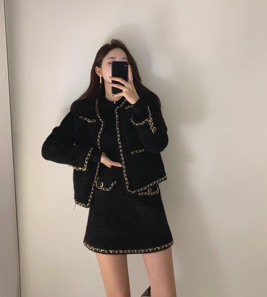 ツイードセットアップ レディース スカート アウター ジャケット タイトスカート ミニ丈 ショート丈 短丈 袖あり 長袖 クルーネック 襟なし Iライン ハイウエスト チェーンデザイン 前開き 厚手 上下セット 2点セット ツーピース かわいい 大人可愛い シンプル カジュアル 大人 上品 お洒落 大人女子 こなれ感 ラブリー キュート ガーリー デイリーユース 無地 春 夏 秋 10代 20代 30代 40代 ビジネス OL 通勤 学生 通学 デート お出かけ 韓国 ファッション トレンド インスタ映え