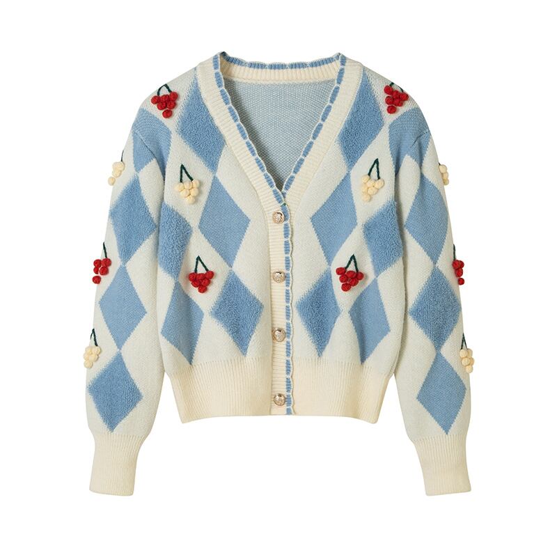 ニットカーディガン レディース Vネック ニット カーディガン アウター 春 秋 おしゃれ お洒落 大人カジュアル カジュアル 長袖 買い物 お出かけ 女子会 デート 通勤 デイリー リトルチェリー さくらんぼ チェリー 上品 保暖防寒 10代 20代 季節の変わり目 レギュラー 暖かい シンプル スリム ブルー 青 ブラック 黒