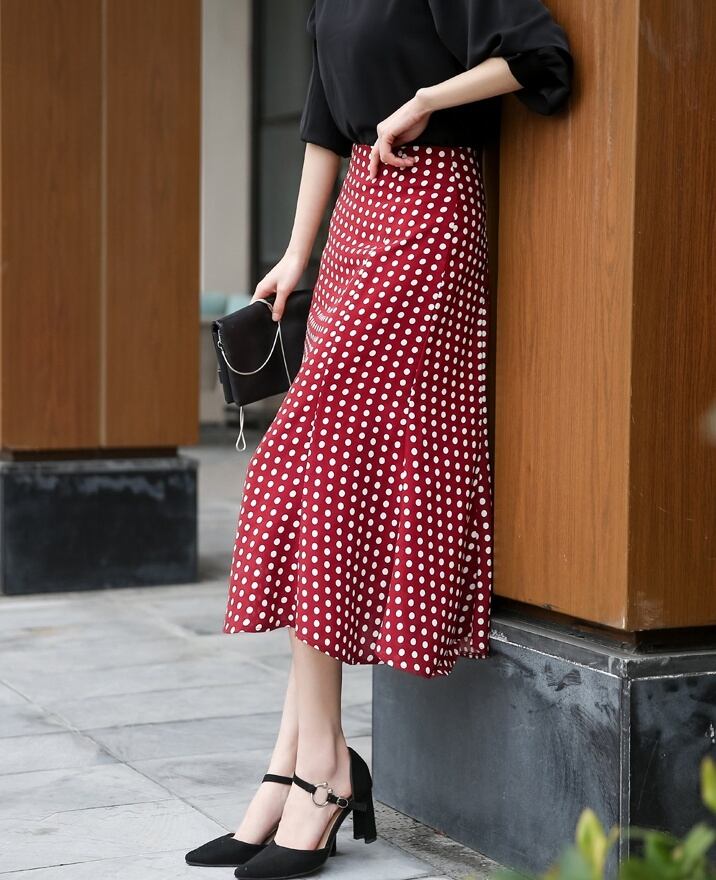 2色 スカート 春夏 かわいい フレアスカート 膝丈 ミモレ丈 ドット柄 水玉 ハイウエスト ブラック レッド かわいい 大人可愛い きれいめ シンプル カジュアル 大人 上品 おしゃれ お洒落 エレガント サイズ XS S M L XL 2XL ラブリー キュート ガーリー 主役級 レディース 女性用 高校生 OL 学生 10代 20代 30代 イベント セレモニー 普段使い ファッション コーデ スタイル 楽ちん 脚長 通学 デート お出かけ 女子会 休日 レストラン ショッピング シフォン