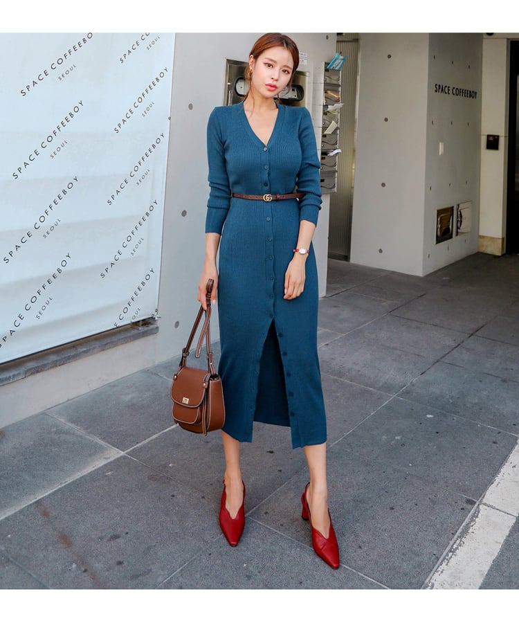 2色 ワンピース 長袖 秋冬 きれいめ ニット ワンピ ミモレ丈 7分丈 深 Vネック 襟なし スリム タイト 細身 Iライン スマート ベルト スリット リブ 黒 ブラック 青 ブルー S M L XL シンプル 大人 上品 おしゃれ 無地 韓国ファッション コーデ スタイル モテ 脚長 プレゼント ギフト こなれ感 セクシー エレガント 主役級 存在感 オフィス OL デート お出かけ 女子会 休日 レストラン ショッピング 映画館 レディース 女性用 OL 10代 20代