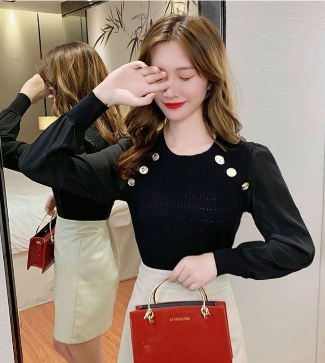 2色 トップス カットソー ニット レディース 秋冬 春 かわいい オフィス 長袖 ショート丈 長袖 ボリューム袖 パフスリーブ Uネック ラウンドネック スリム 細身 切り替えデザイン ドッキング シフォン ケーブルニット 透け感 黒 ブラック オフホワイト S M L XL 大人可愛い きれいめ シンプル 大人 上品 おしゃれ 無地 韓国 韓国ファッション コーデ スタイル 楽ちん 着回し モテ 体型カバー 普段使い トレンド インスタ映え 10代 20代 30代 キュート エレガント 主役級