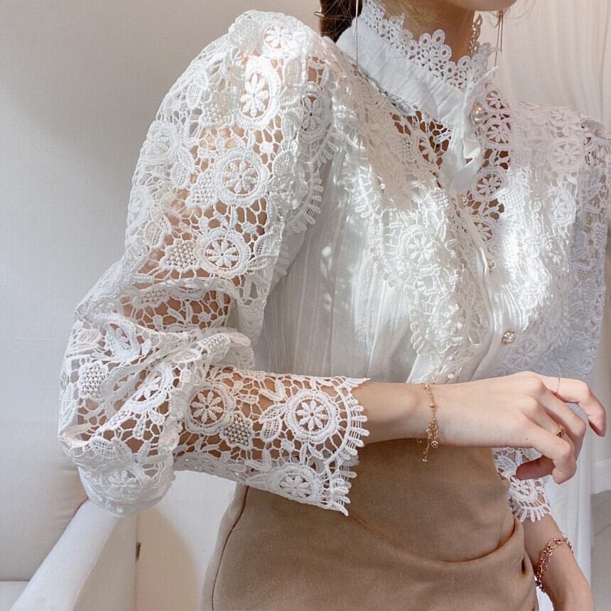 3色 レトロ風 トップス シャツ ブラウス レディース 春 秋 きれいめ 長袖 ショート丈 長袖 ボリューム袖 フリル袖 スタンドカラー スリム レース 刺繍 前開き 透け感 白 ホワイト 黒 ブラック 大人カラー アプリコット S M L ジャスト 大人可愛い きれいめ 大人 上品 おしゃれ レトロ 無地 花柄 コーデ スタイル 着回し モテ 体型カバー トレンド 重ね着 10代 20代 30代 キュート 個性的 エレガント 主役級 存在感 OL 通勤 学生 通学