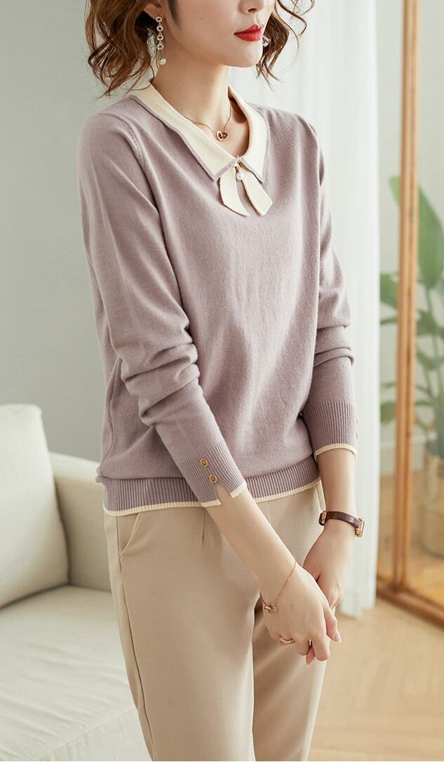 3色 レトロ風 トップス ニット レディース 春 秋 きれいめ オフィス 長袖 長袖 襟付き レギュラーカラー スリム タイト 細身 リボン ボトミング 紫 パープル 茶色 ブラウン ピンク L XL 2XL 3XL 大人可愛い きれいめ シンプル 大人 上品 おしゃれ 無地 コーデ スタイル 着回し モテ 普段使い 20代 30代 40代 こなれ感 エレガント モダン オフィス OL 通勤 デート お出かけ 女子会 休日 ショッピング 映画館 レディース 女性用 ママ OL
