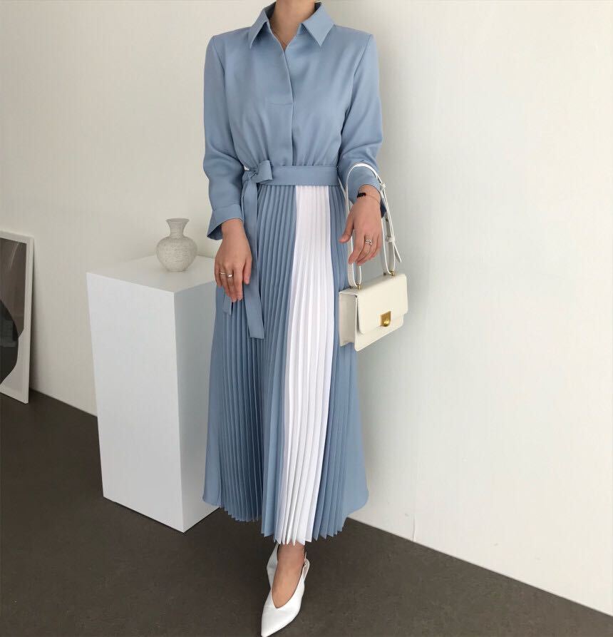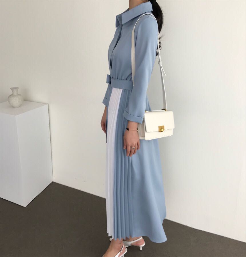 2色 ワンピース 長袖 春 秋 きれいめ シャツワンピース Aライン プリーツスカート ロング ロング丈 襟付き 角襟 フレア スリム 細身 切り替えデザイン ドッキングワンピース プリーツ リボン バックリボン ハイウエスト 黒 ブラック 青 ブルー バイカラー ワンサイズ 大人可愛い きれいめ 大人 上品 おしゃれ 無地 スタイル 着回し モテ 体型カバー 脚長 普段使い エレガント モダン 主役級 存在感 とろみ感 ビジネス OL 通勤 デート お出かけ 女子会 休日 パーティー レストラン