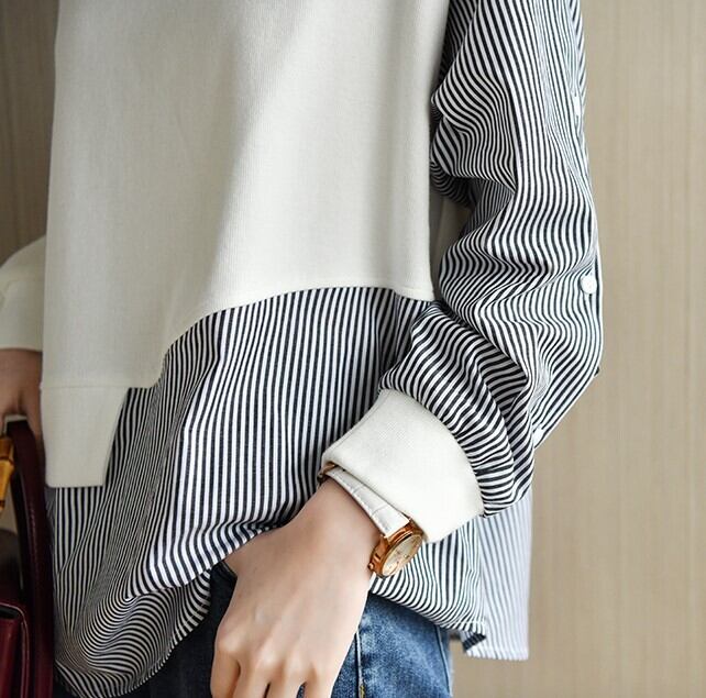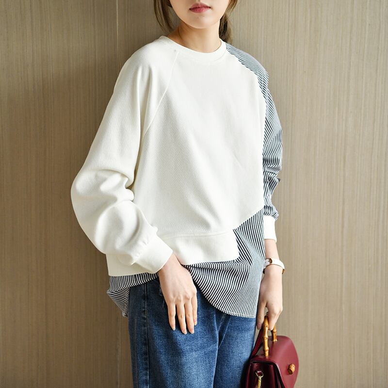 トップス シャツ カットソー プルオーバー レディース 春 秋 カジュアル 長袖 ショート丈 ゆったり 長袖 Uネック ラウンドネック 襟なし ノーカラー 切り替えデザイン ドッキング 白 ホワイト 青 ブルー 春カラー M L 大人可愛い きれいめ シンプル カジュアル 大人 おしゃれ ナチュラル リラックス 無地 ストライプ 韓国系 コーデ スタイル 楽ちん 着回し 体型カバー 普段使い トレンド 重ね着 10代 20代 30代 こなれ感 ラフ エレガント 存在感 オフィス ビジネス OL 通勤