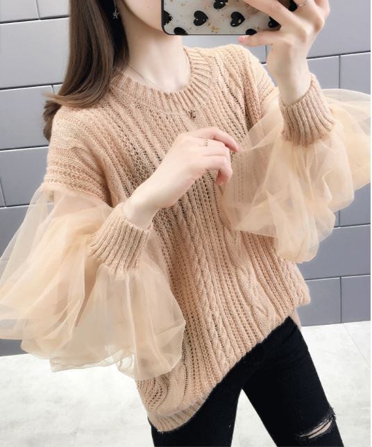 トレンドライクに仕上げる袖チュールニットプルオーバー。