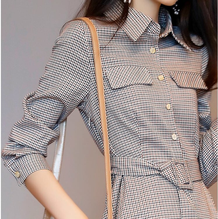 レトロ風 ワンピース 長袖 春夏 かわいい ロング aライン シャツワンピース aライン Aライン フレア ワンピドレス 膝丈 ひざ丈 膝上 ミモレ ミモレ丈 ロング ロング丈 襟付き ポロカラー フレア セミフレア Aライン ベルト ウエストマーク ボタン カーキ 大人カラー 春カラー 秋カラー ワンサイズ S M L XL 小さいサイズ 大きいサイズ 大きい 大きめ かわいい 大人可愛い きれいめ シンプル カジュアル 大人 上品 おしゃれ ナチュラル かっこいい レトロ リラックス チェック柄