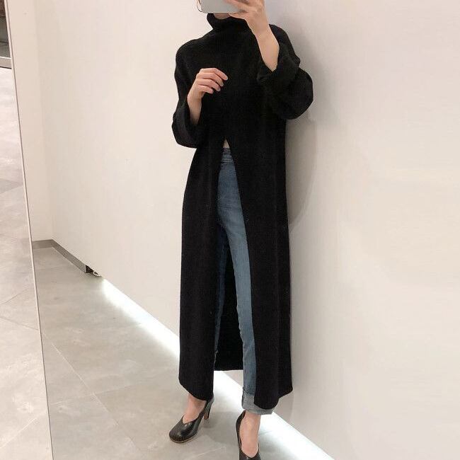 フロントに大胆なスリットが入ったロング丈のニットセーター。