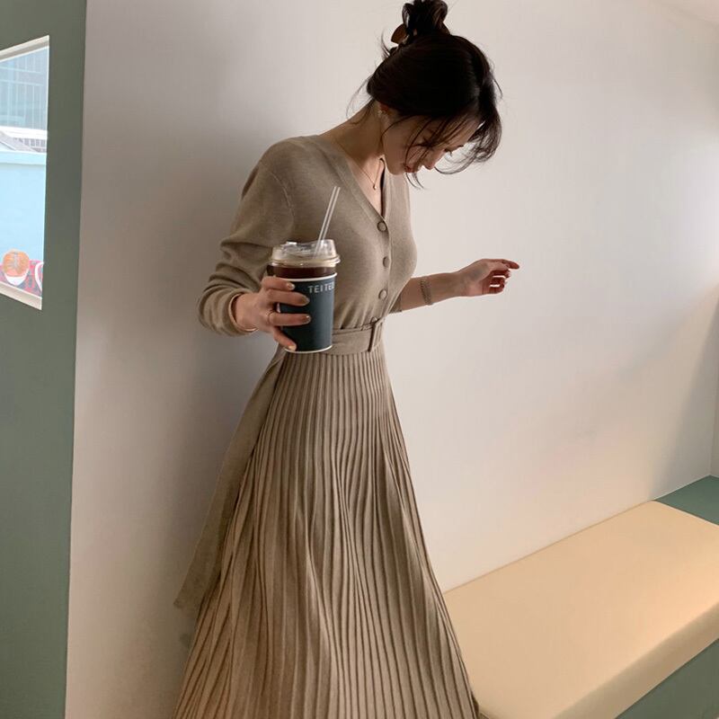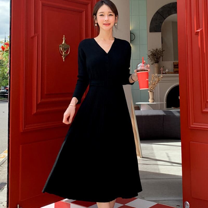2色 ワンピース 長袖 秋冬 きれいめ 大きいサイズ ロング フォーマル aライン ニット ワンピ ミモレ丈 Vネック セミフレア プリーツ ベルト ウエストマーク 黒 ブラック ベージュ S M L XL 大人可愛い きれいめ シンプル 大人 上品 おしゃれ ナチュラル 無地 コーデ スタイル 楽ちん 着回し 暖かい 防寒 体型カバー トレンド 流行 インスタ映え こなれ感 主役級 存在感 ビジネス OL 通勤 デート お出かけ パーティー イベント 誕生日 入学式 入園式 ニット