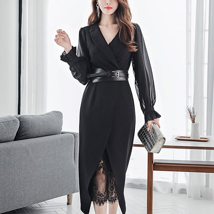 2色 ワンピース 長袖 春夏 秋冬 きれいめ フォーマル ワンピドレス ペンシルスカート タイトスカート 膝下 ミモレ丈 ロング丈 アンクル丈 7分丈 ミドル丈 袖コンシャス キャンディスリーブ フレアスリーブ ベルスリーブ Vネック 深 Vネック カシュクール 襟付き スリム タイト 細身 ストレート Iライン 切り替えデザイン ドッキング レース 刺繍 チュール ウエストマーク 前開き 透け感 シースルー 白 ホワイト 黒 ブラック S M L XL 大人可愛い きれいめ シンプル 大人 上品