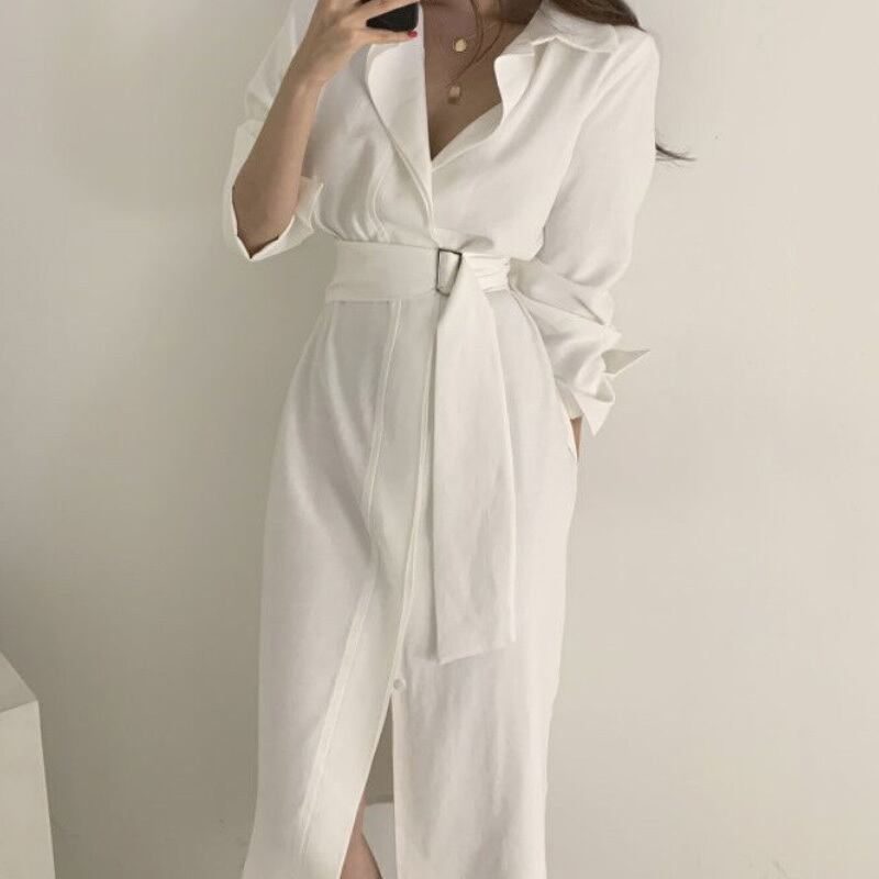 3色 ワンピース 長袖 秋冬 きれいめ シャツワンピース 膝下 ミモレ丈 襟付き 大きな襟 スリム 細身 ストレート スマート ベルト スリット 前開き ホワイト ブラウン グレー ワンサイズ フリーサイズ ジャスト 大人可愛い きれいめ シンプル 上品 おしゃれ ナチュラル かっこいい 無地 モテ 美脚 脚長 普段使い こなれ感 クール モード系 セクシー エレガント 主役級 OL 通勤 ママコーデ デート お出かけ 女子会 休日 パーティー イベント 旅行 レストラン レディース 女性用 OL