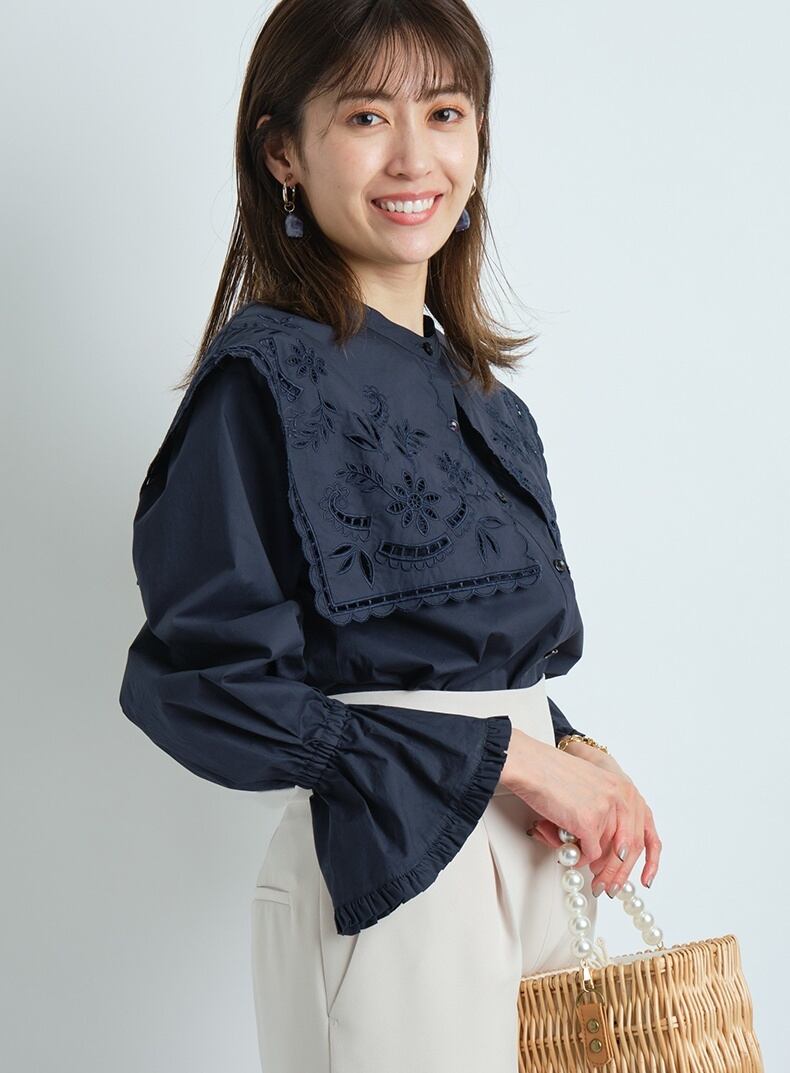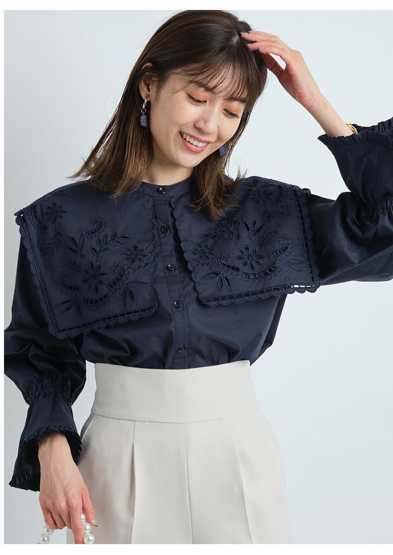 トップス ブラウス カットソー レディース 春 秋 かわいい ゆったり 長袖 長袖 ボリューム袖 萌袖 フリル袖 襟付き 大きな襟 ワイドカラー でか襟 ビッグカラー フレア セミフレア 刺繍 フリル プルオーバー ネイビー 大人カラー 春カラー 秋カラー ワンサイズ S 小さいサイズ ジャスト かわいい 大人可愛い きれいめ 大人 上品 おしゃれ レトロ 無地 韓国 韓国系 オルチャン 韓国ファッション コーデ スタイル モテ 普段使い インスタ映え 10代 20代 30代 ラブリー キュート