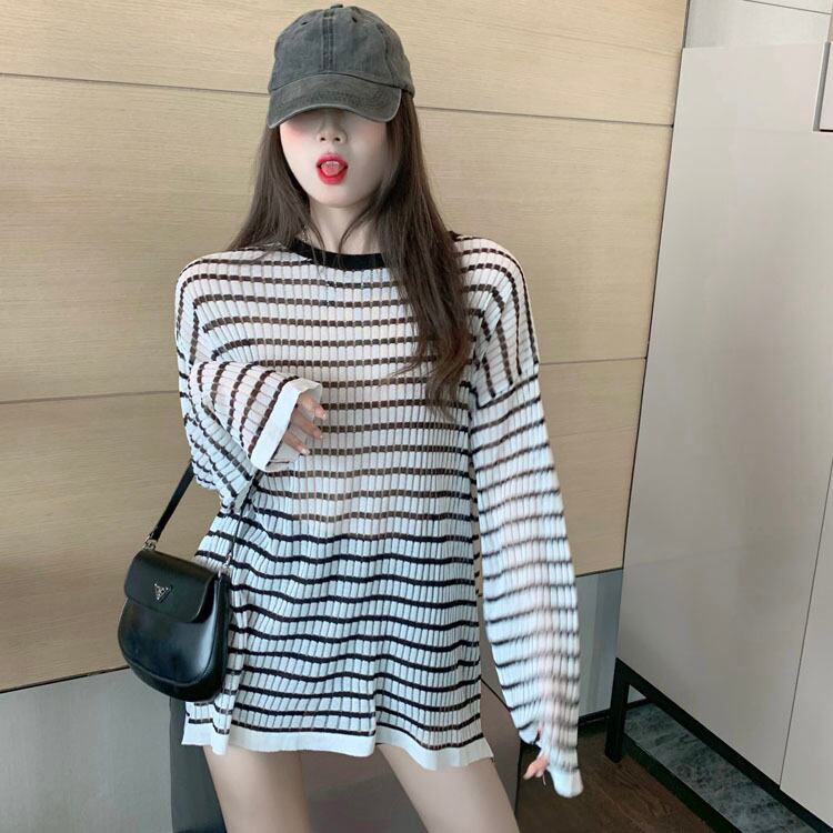 ゆったりルーズで透け感のあるボーダー柄トップス