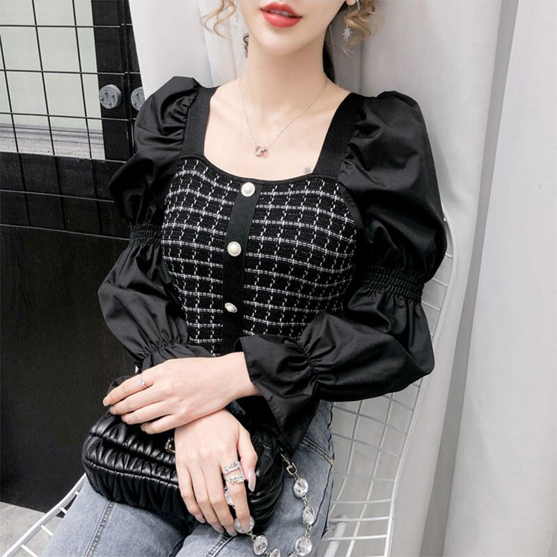 2色 レトロ風 トップス ブラウス レディース 春 秋 かわいい きれいめ 長袖 ミニ ショート ショート丈 ミニ丈 へそ出し 長袖 ボリューム袖 パフスリーブ ホルンスリーブ ベルスリーブ フリル袖 スクエアネック スリム タイト 細身 ストレート 切り替えデザイン ドッキング 刺繍 シフォン 透け感 プルオーバー 袖コンシャス 白 ホワイト 黒 ブラック S M L かわいい 大人可愛い きれいめ シンプル 大人 上品 おしゃれ 格子柄 千鳥格子 韓国 韓国系 オルチャン 韓国ファッション モテ