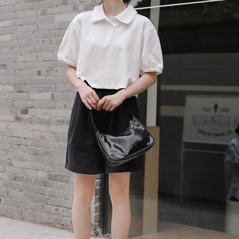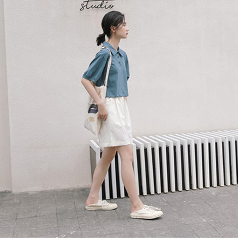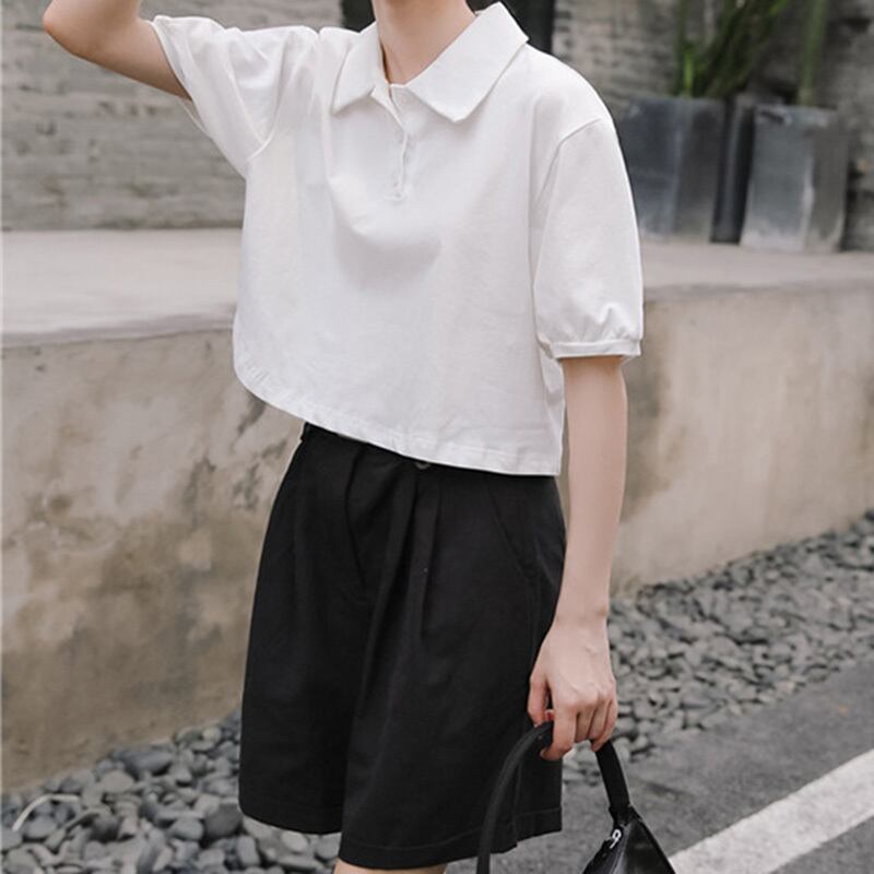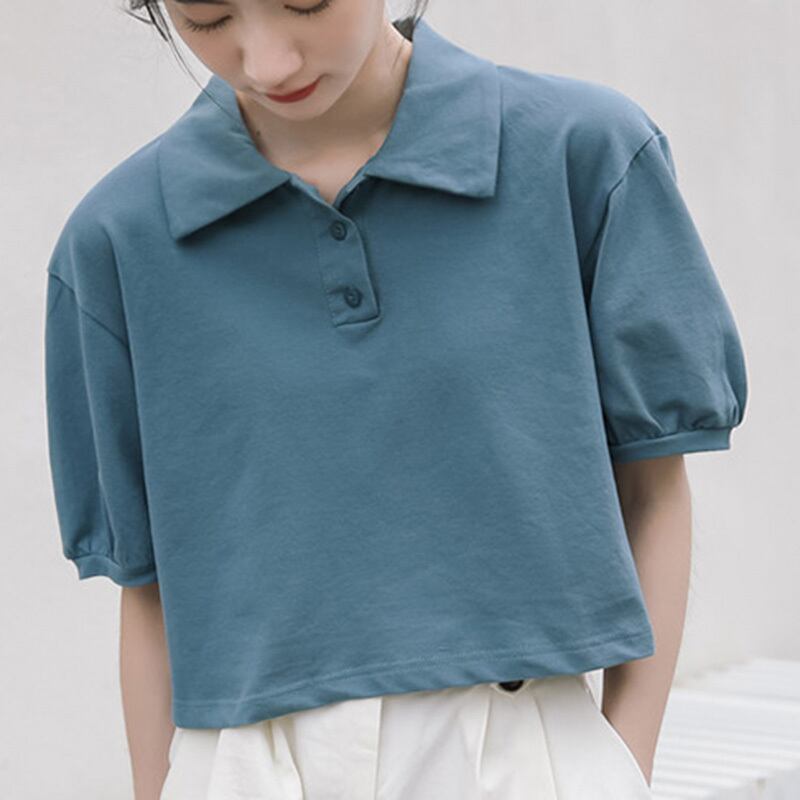 2色 レトロ風 ポロシャツ トップス ブラウス レディース 春夏 かわいい カジュアル 半袖 ショート ショート丈 半袖 五分袖 ボリューム袖 パフスリーブ 襟付き ポロカラー レギュラーカラー スリム タイト 細身 ストレート 伸縮性 シンプル 白 ホワイト 青 ブルー ワンサイズ フリーサイズ かわいい 大人可愛い シンプル カジュアル おしゃれ ナチュラル 無地 韓国 韓国系 オルチャン 韓国ファッション スタイル 体型カバー 定番 普段使い こなれ感 ラフ メンズライク マニッシュ ボーイッシュ
