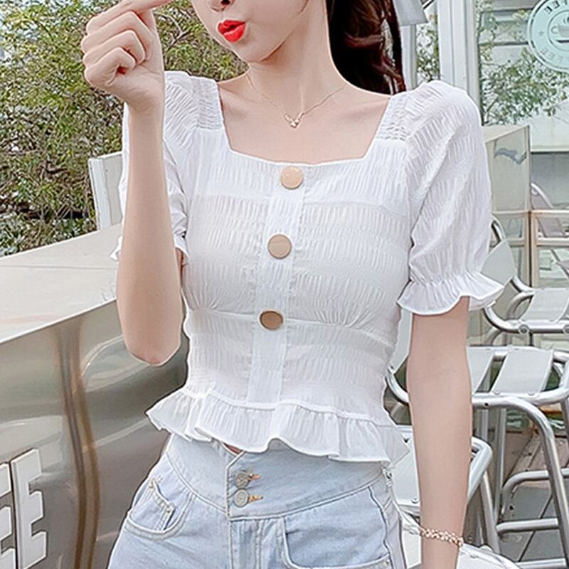 2色 コンパクト トップス ブラウス カットソー プルオーバー レディース 春 夏 かわいい きれいめ カジュアル 白シャツ 半袖 ミニ ショート ショート丈 ミニ丈 半袖 五分袖 ボリューム袖 パフスリーブ スクエアネック スリム タイト 細身 ストレート フリル ウエストゴム 透け感 プルオーバー シンプル 白 ホワイト 緑 グリーン 春カラー S M L XL かわいい 大人可愛い きれいめ シンプル カジュアル 上品 おしゃれ レトロ 無地 韓国 オルチャン 韓国ファッション インスタ映え