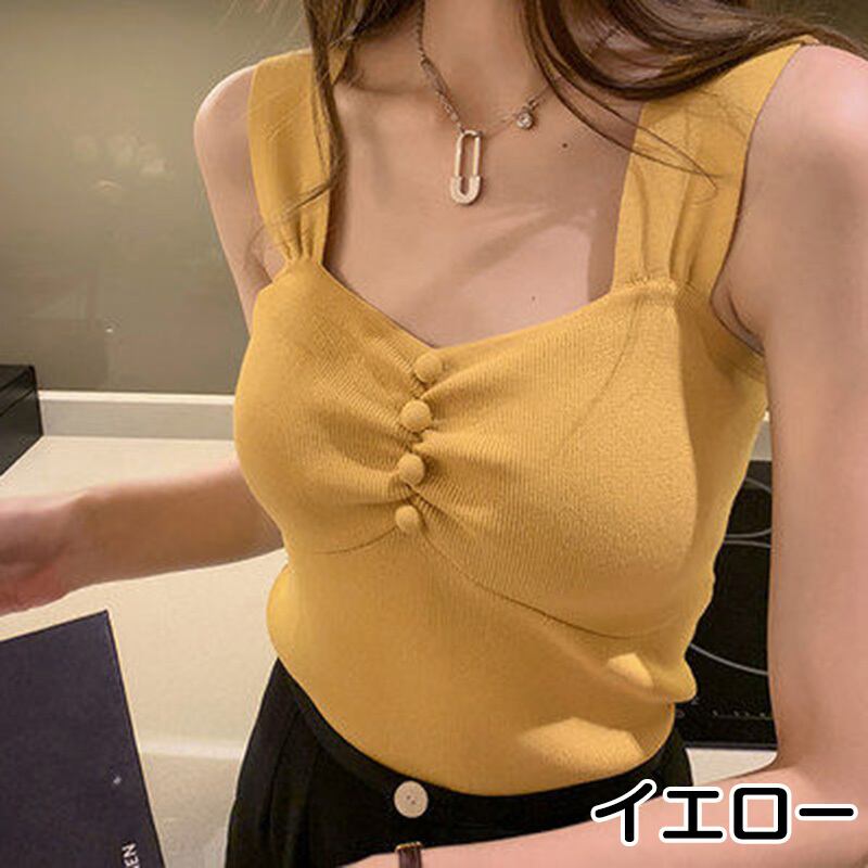 6色 トップス ニット キャミソール レディース 春 夏 かわいい カジュアル ショート ショート丈 袖なし ノースリーブ Uネック ラウンドネック スリム タイト 細身 ストレート 裾イン シンプル くるみボタン 白 ホワイト 黒 ブラック 青 ブルー 緑 グリーン 黄色 イエロー ピンク くすみカラー S M L XL かわいい 大人可愛い きれいめ シンプル カジュアル 大人 おしゃれ ナチュラル 無地 韓国 韓国系 オルチャン 韓国ファッション インスタ映え 10代 20代 30代 こなれ感