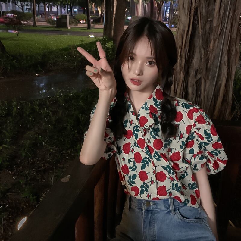 ふんわりとしたパフスリーブと、ゴージャスなローズプリントが魅力的。