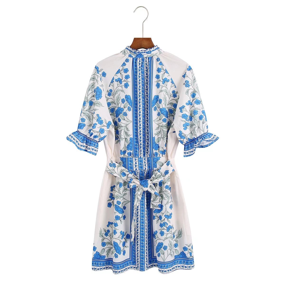 レトロ風 ワンピース 半袖 春夏 かわいい シャツワンピース フレア ミモレ ミモレ丈 7分丈 ミディアム丈 ミドル丈 五分袖 フリル袖 ボリューム袖 袖コンシャス ベルスリーブ Vネック フレア セミフレア フリル リボン バックリボン 青 ブルー 春カラー XS S M L 小さいサイズ 大きいサイズ ゆったり ゆる かわいい 大人可愛い カジュアル 大人 おしゃれ ナチュラル レトロ アジアン エスニック エキゾチック リラックス 花柄 フラワー 韓国 韓国系 オルチャン 韓国ファッション