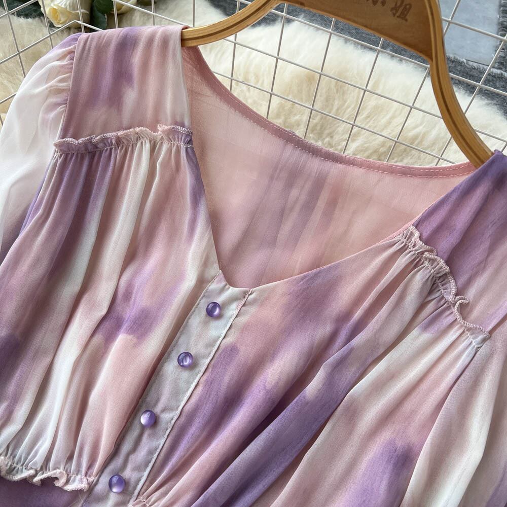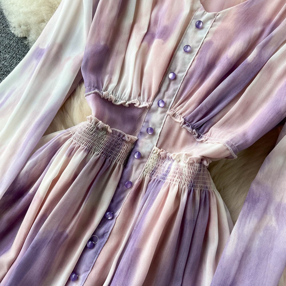 ワンピース レディース 夏 サマー 長袖 袖あり Vネック ドレス 紫 パープル エレガント フェミニン ハイウエスト Aラインスカート ロングスカート 可愛い 大人可愛い フェミニン エレガント お洒落 お出かけ 女子会 ショッピング お出かけ デート 合コン ふんわり
