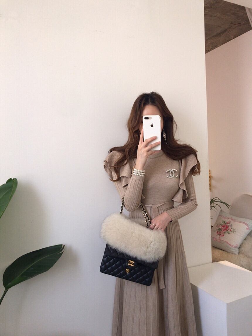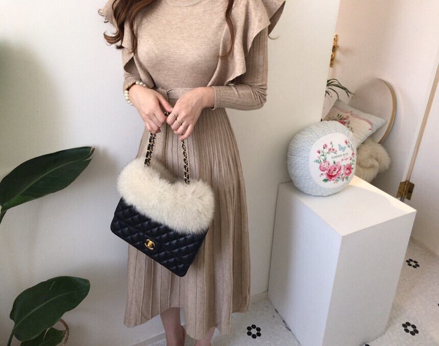 肩から胸元へ伸びたフリルが大人可愛い雰囲気をプラス。