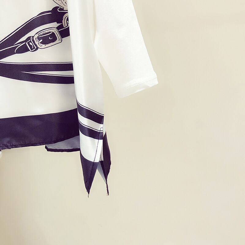 おしゃれなスカーフ柄でコーデの幅も広がる。ゆったり体型カバーにも◎