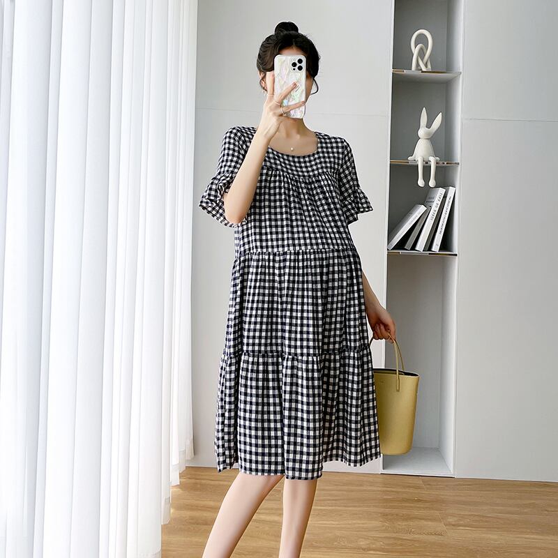 ワンピース レディース マタニティ マタニティワンピ マタニティウェア ミドル丈 チェック ギンガムチェック 黒 ブラック 膝下 夏 大きいサイズ ラウンドネック 丸首 半袖 夏 ゆったり 体型カバー リラックス おでかけ 大人 カジュアル きれいめ シンプル オーバーサイズ 20代 30代 40代 M L XL