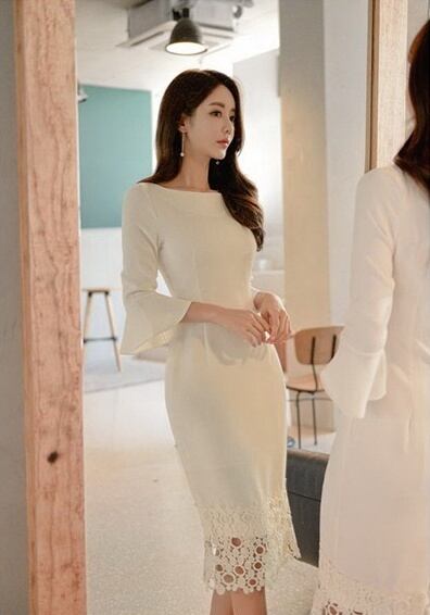 演奏会ドレス レディース 結婚式 二次会 お呼ばれ パーティー 同窓会 ミドル丈 レース エレガント トランペットスリーブ クルーネック ボードネック ホワイト 白 大人カジュアル 可愛い かわいい きれいめ 七分袖 ワンピース ミドル丈スカート 無地 プレーン 女子会 謝恩会 美シルエット フレンチスタイル シンプル