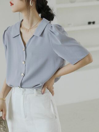 V明きとろみブラウス レディース トップス ブラウス 袖あり 半袖 パフスリーブ Vネック 襟付き 薄手 かわいい 大人可愛い シンプル カジュアル 大人 上品 お洒落 大人女子 こなれ感 ラブリー キュート ガーリー とろみ感 抜け感 デイリーユース 無地 春 夏 秋 10代 20代 30代 40代 オフィス ビジネス OL 通勤 学生 通学 デート お出かけ 韓国 ファッション 体系カバー トレンド インスタ映え